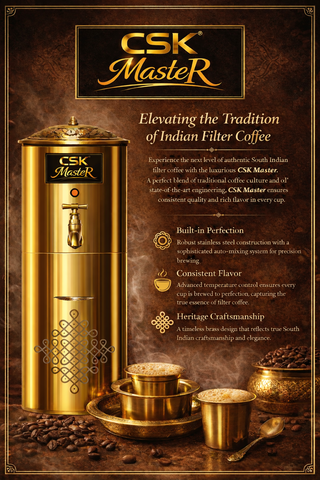 CSK Signature Filter Coffee Decoction - Crafted with precision and tradition, our Filter Coffee Decoction is a rich, concentrated extract prepared through the slow percolation of freshly roasted and finely ground coffee in a traditional South Indian filter. This time-honored brewing method preserves the depth, aroma, and character of authentic filter coffee. To serve, blend 20 ml of decoction with 100 ml of steaming hot milk. Adjust the decoction for a bolder, more intense experience. Add sugar to taste, stir well, and enjoy. Indulge in the timeless elegance of true South Indian Filter Coffee — refined, aromatic, and unforgettable.